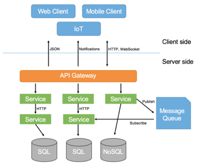 Finalmente, como los servicios son muy granulares, las aplicaciones cliente generalmente necesitan interactuar con múltiples servicios para obtener los datos que necesitan. Para permitir cambios en los servicios sin afectar a los clientes, se utiliza una API Gateway. API Gateway es una capa abstracta que oculta a todos los microservicios, dejando un único Endpoint para que los clientes se comuniquen. Las solicitudes que lleguen al Gateway serán procesadas/enrutadas hacia los servicios específicos. El Gateway también nos permite monitorear fácilmente el tráfico y uso de los servicios.