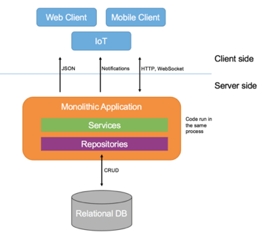 En el diseño tradicional de tres capas, la aplicación del servidor de aplicaciones asume el rol de capa media al procesar la lógica de negocio y servir los datos desde la capa de base a los clientes (navegadores web, aplicaciones móviles, internet, etc.). La aplicación está escrita como una única base de código, acoplada y todo se ejecuta en el mismo proceso. El escalamiento se realiza mediante la replicación de la misma aplicación monolítica en múltiples servidores o instancias de ejecución (en la nube).